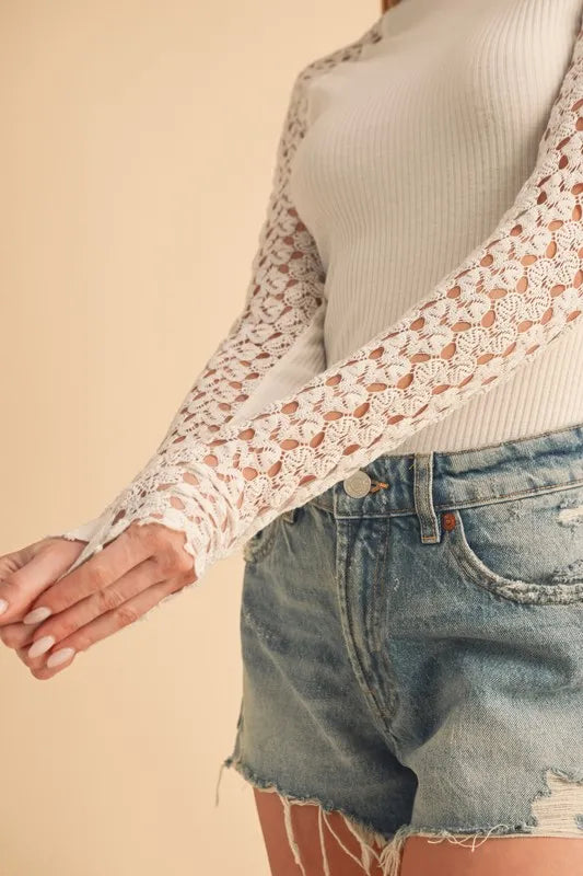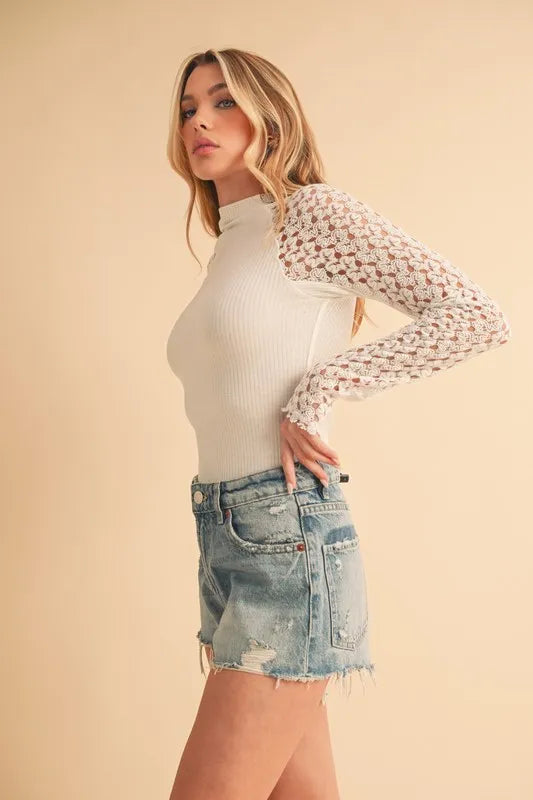 Lessivo Mock Neck Lace Long Sleeve Knit Top
