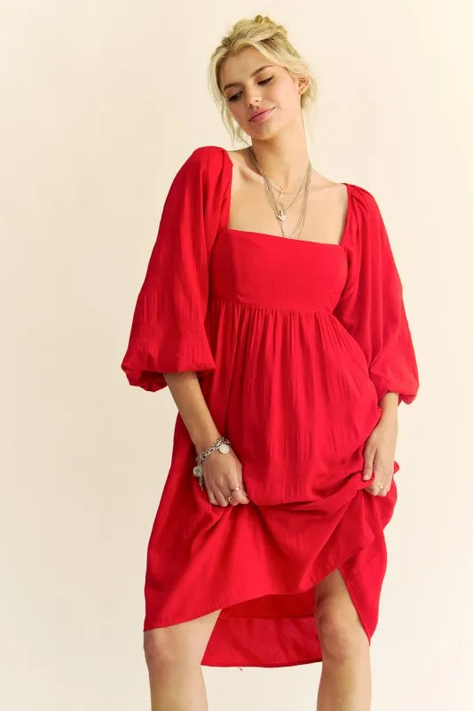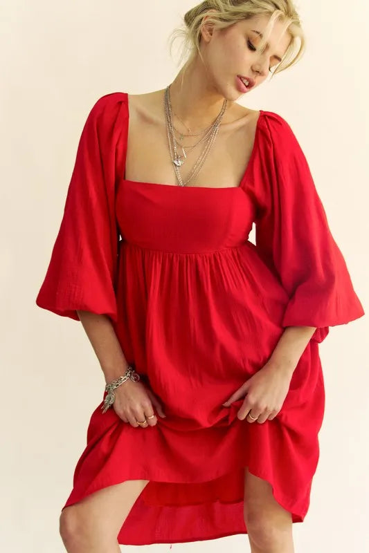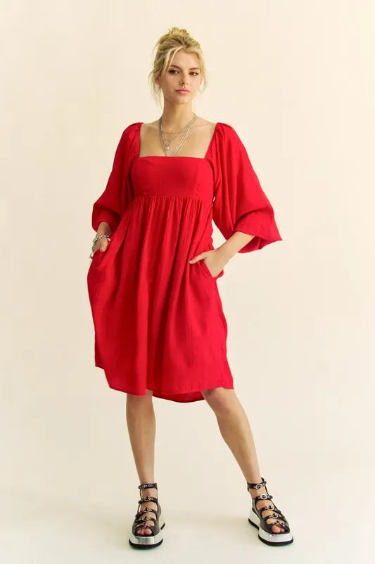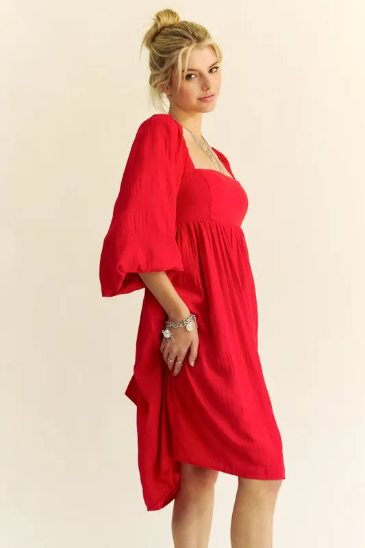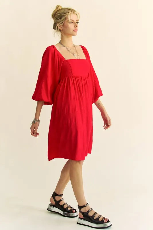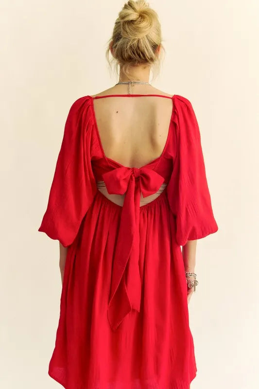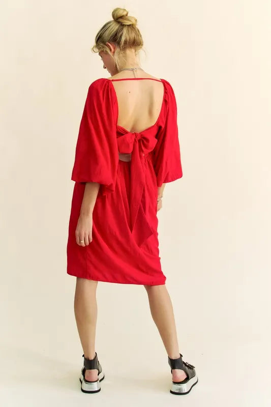 Lessivo Solid Textured Fabric Puff Sleeve Tie-Back Dress