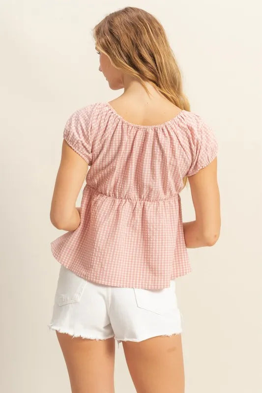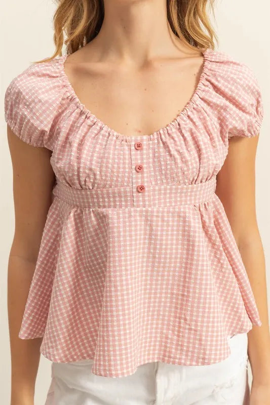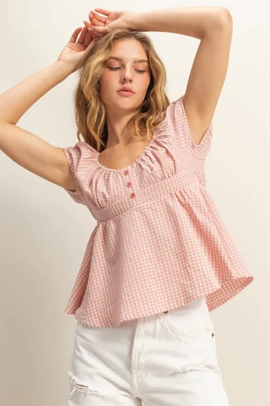 Lessivo Gingham Peplum Scoop Neck Blouse