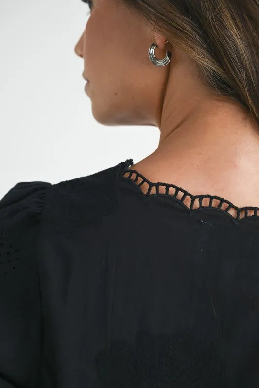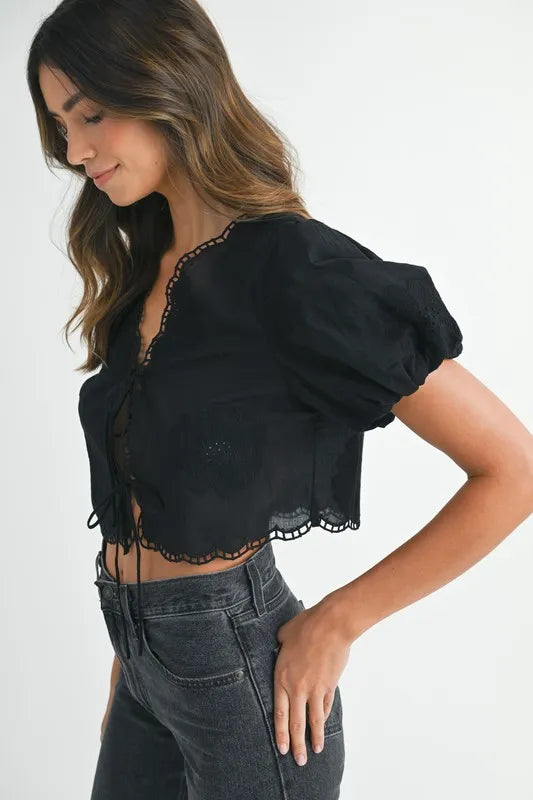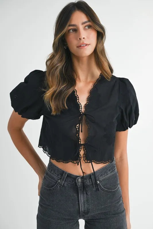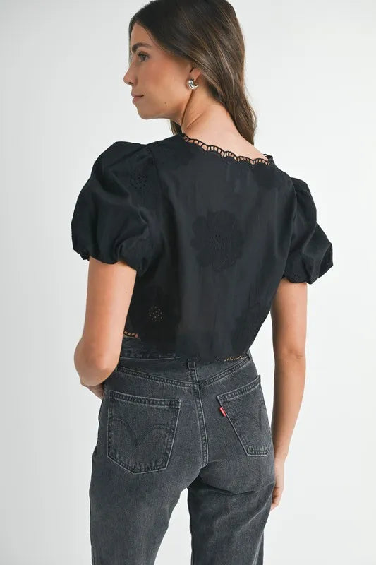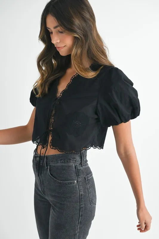 Lessivo Embroidered Bubble Sleeve Crop Top