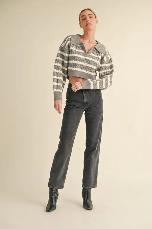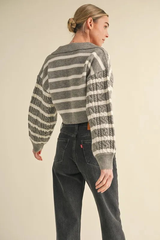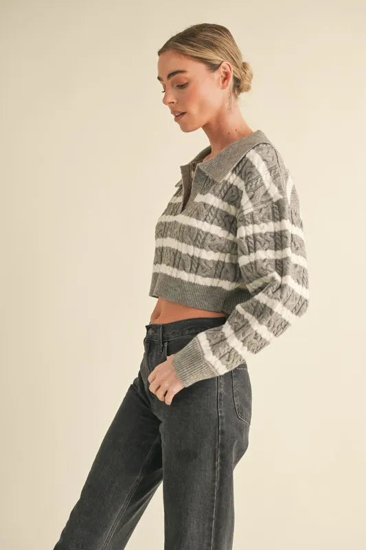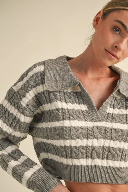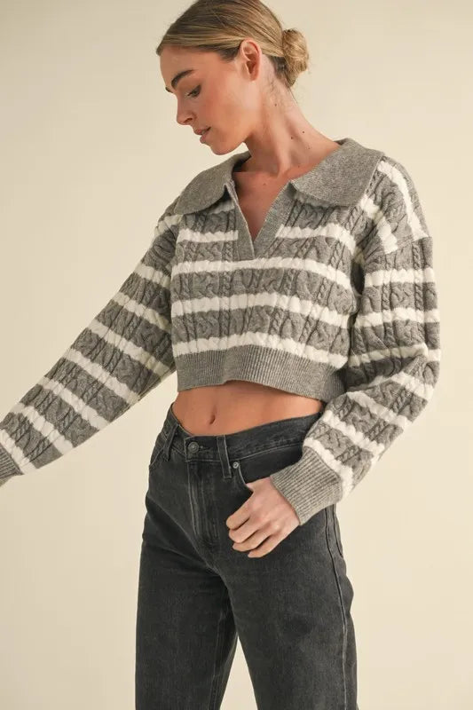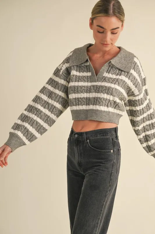 Lessivo Pale Collared Striped Cropped Cable Knit Sweater