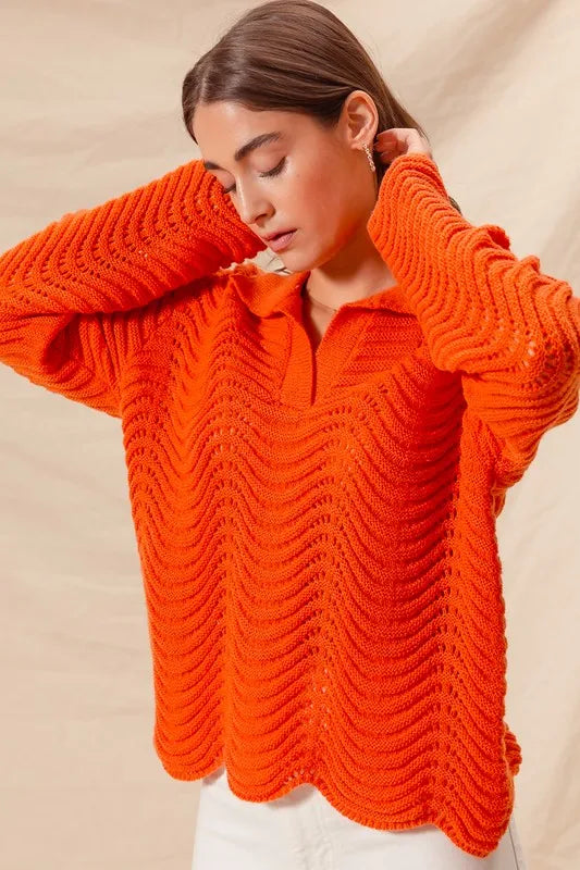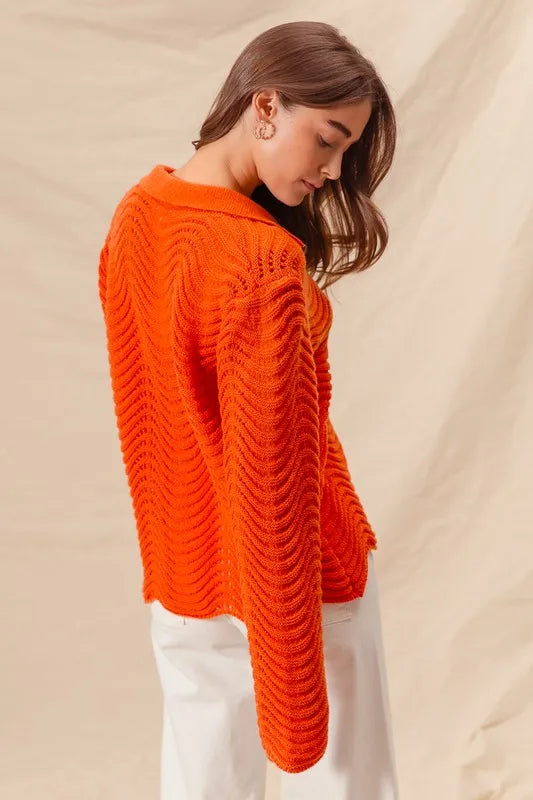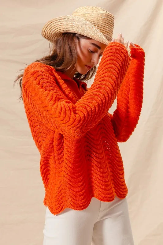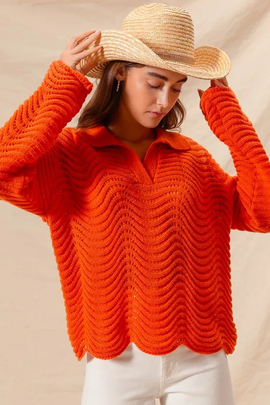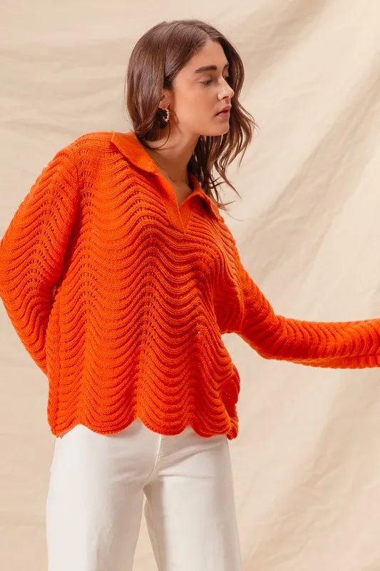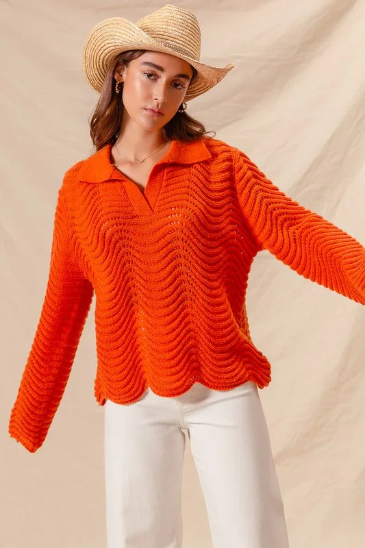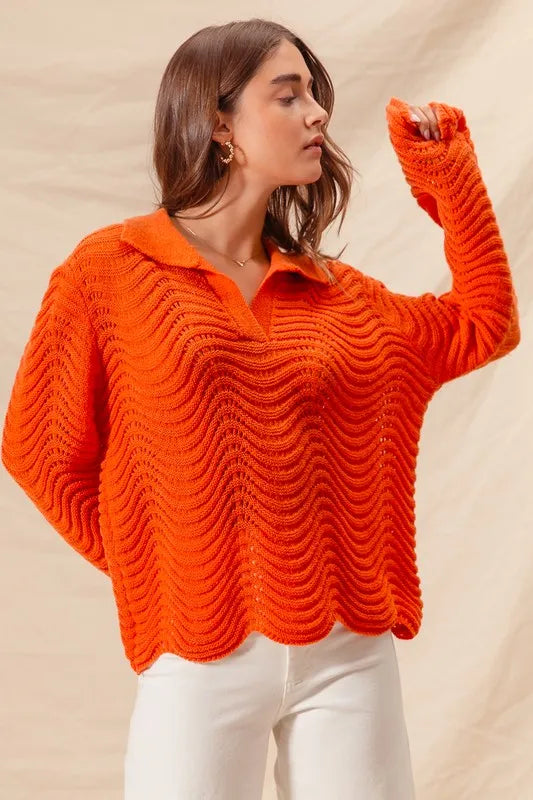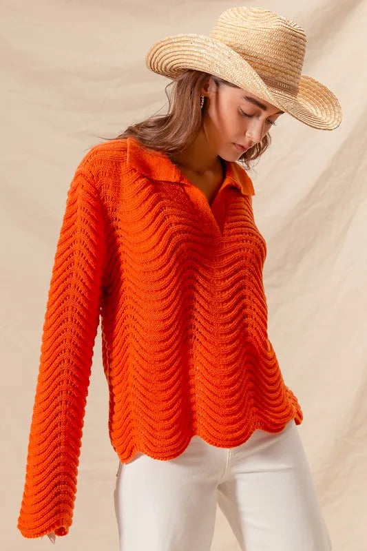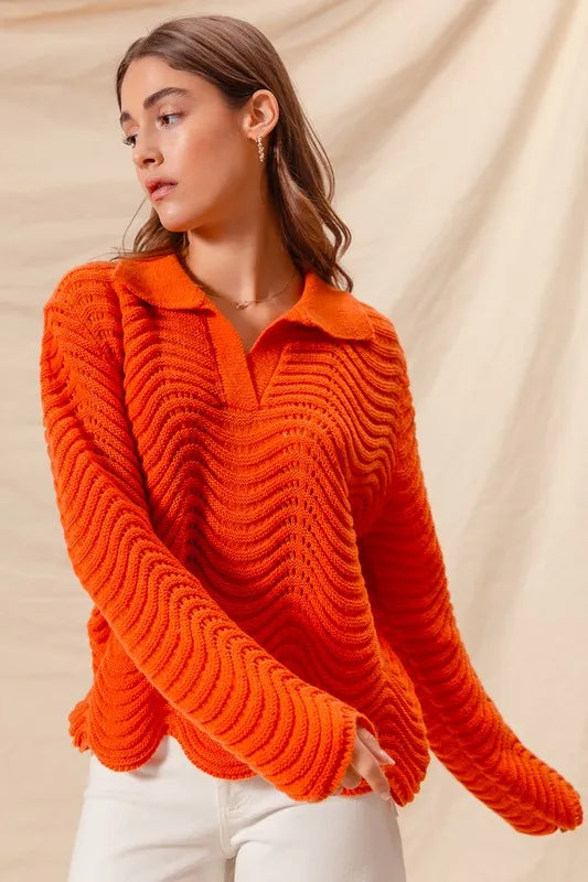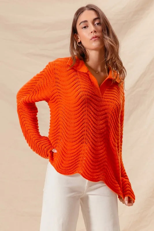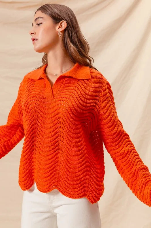 Lessivo Notched Collar Wavy Texture Sweater Top